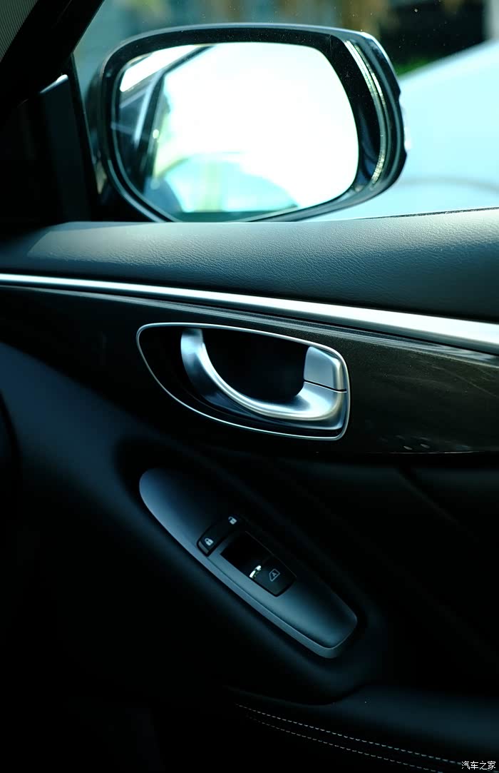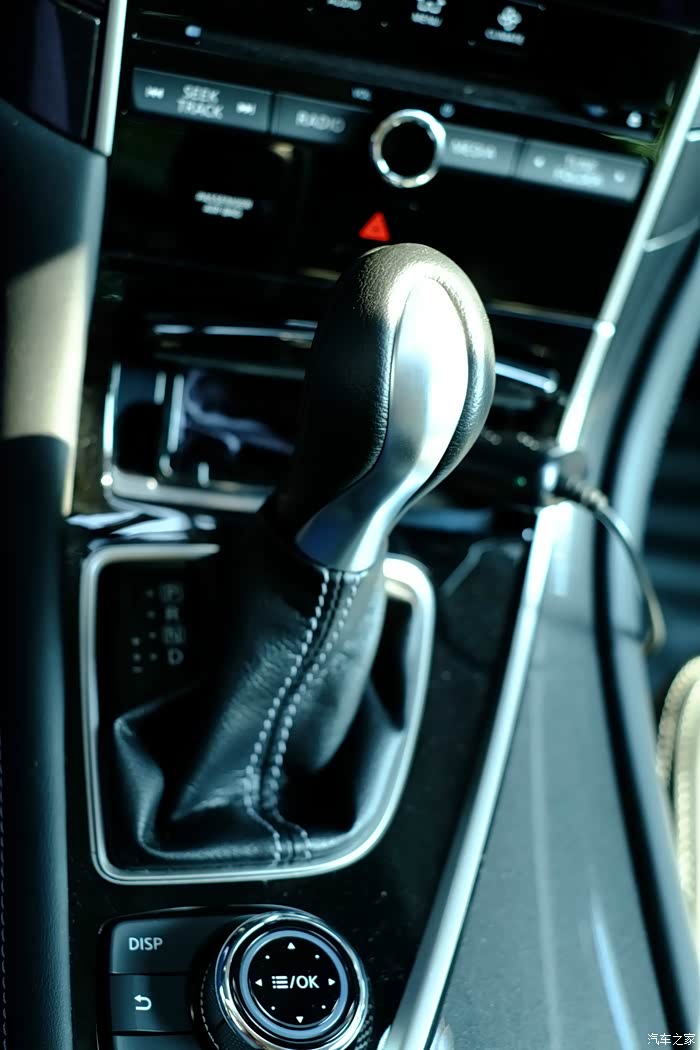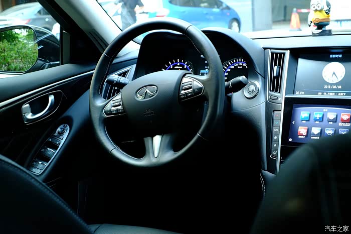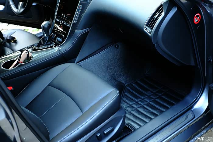 2、内饰。我极为看重车的内饰,Q50的内饰最大优势就是没有味道。真的,一点味道都没有,让身为2岁幼儿之爹的我很满意。车是今年1月出厂的,5月提车时一点味道都闻不到。也许是车出场时间长,但朋友的某款臭大街款开了大半年了,还能闻到让人不快的味道。虽然很多人觉得真皮座椅夏天热冬天凉,但我还是觉得真皮座椅更舒服,尤其是绣了“INFINITI”字样的真皮座椅。座椅的支撑性和舒适度都很到位,让长途驾车时屁股不那么受罪腰部不那么苦情。话说日产貌似对汽车座椅颇有心得,天籁的座椅就整的像是沙发。至于双屏,因为我的车没有导航,所以上屏除了显示倒车视频就是显示闹钟,有点屈才了。值得诟病的就是储物空间太少。