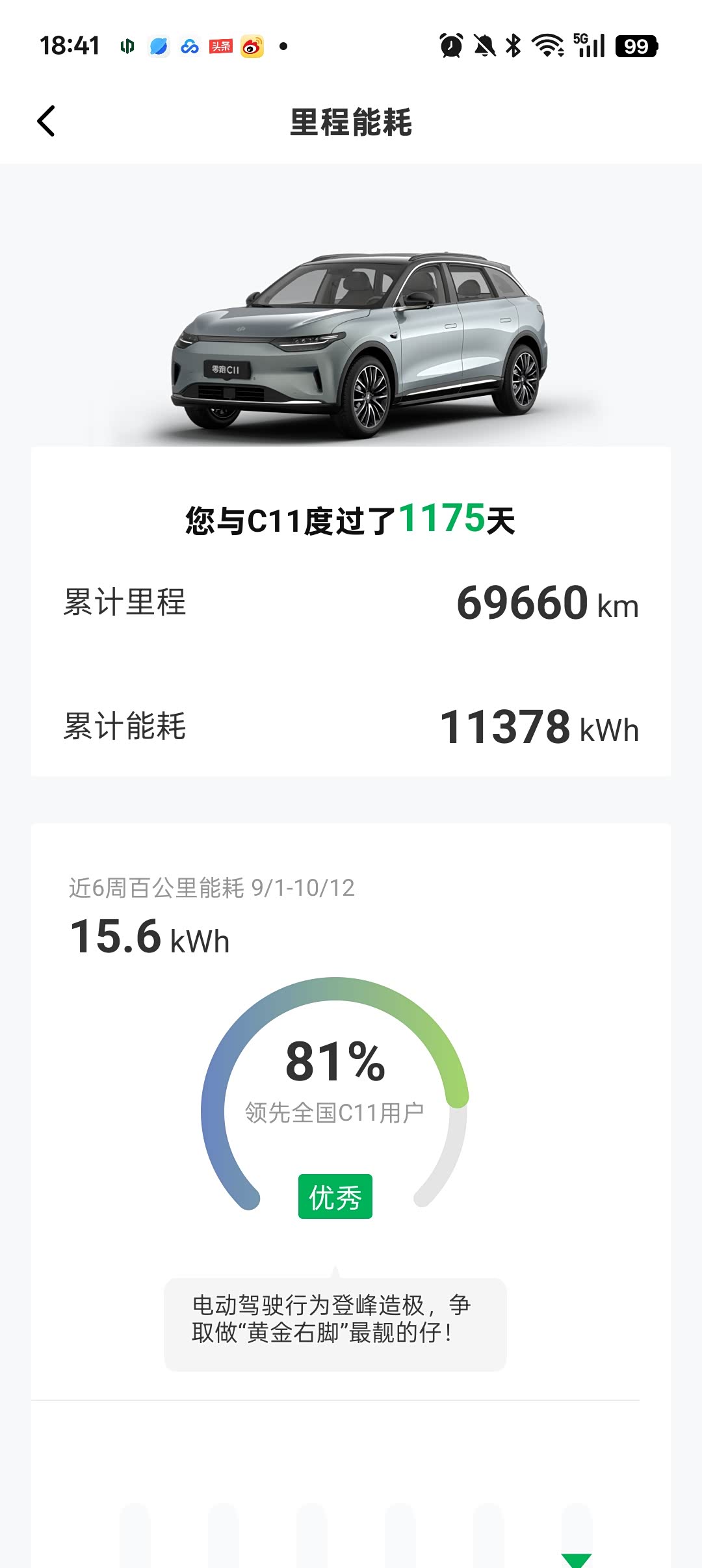 🚙电池SOH90.6%🔋,充满动态续航味474公里。本周实际行驶531公里🛣️,综合能耗16.2kwh,实际消耗续航558公里,零跑C11的续航达成率达到95%,我要回到领先90%以上车友还得看海口的冬季续航😎❗️