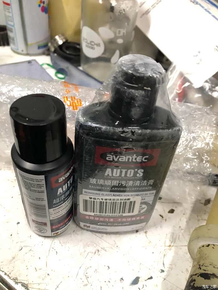 玻璃顽固污渍清洁剂+浓缩雨刷精(好像是少了清洁海绵,没有也没事儿,车里还有几块)