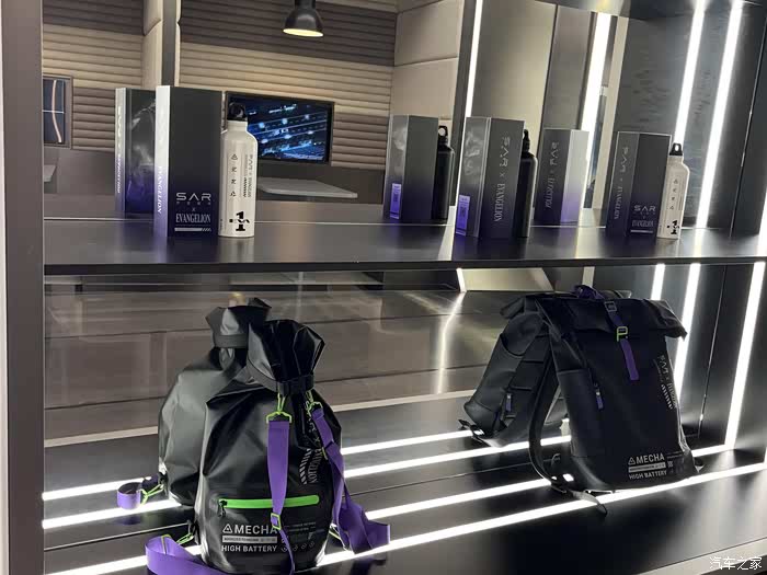 让我没想到的是店内摆放了很多EVA的手办,不过联想到机甲龙有初代机联名款,也可以理解,虽然店内摆放的 是量产款的车辆但是其他款式必要的元素也是要有的嘛,而且居然还有跟初代机一样紫色袋子的包,等后面我买车的时候一定要从店里让销售顾问送我一个。
