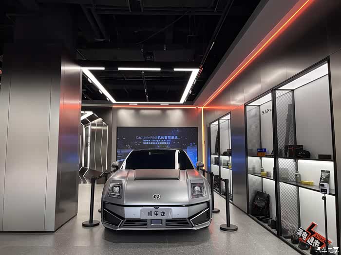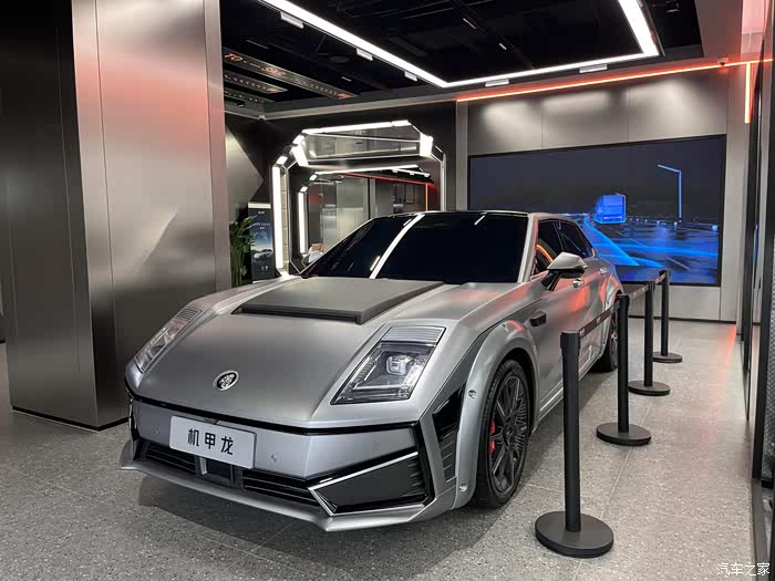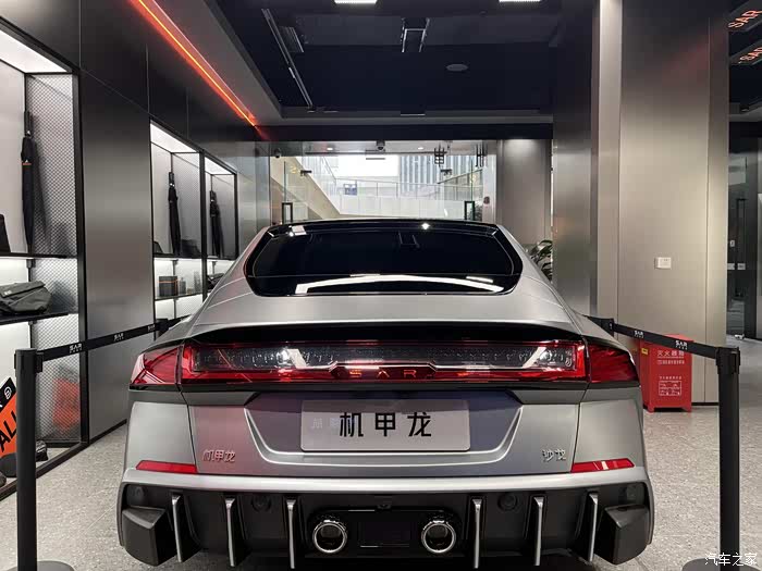 杭州的城市展厅位于杭州城西银泰城,虽然距离我有一定的距离但是为了梦想,我决定还是要冲一下,店门黑色网格搭配白色字体的门头,不管是从材质还是从颜色来看都感觉很硬派,一进门首先看到都就是一辆灰色都机甲龙摆在门都右边,根据我之前都了解,这是一台量产版都机甲龙,这跟我之前看过的新能源车完全不一样,棱角明显的外观区别于我之前的比亚迪圆滑的造型,但是这也是机甲风独特的魅力,虽然从空气动力学角度来说,圆滑的外观对性能更有力,但是作为外貌党来说,帅!才是硬实力。