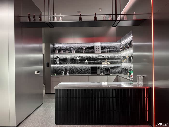 最后说说店内的环境吧,整体而言装修比较偏简约风,黑灰为主的颜色搭配,别看是个汽车展厅,居然还搭配了个小水吧,不过因为刚开业以及目前口罩原因所以不提供制作的饮品,如果能坐在这面对像机库一样墙壁的水吧喝一杯饮料感觉应该会很爽。