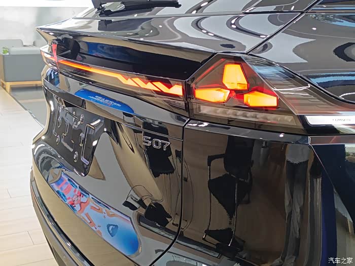 S07点亮后的一体式尾灯连同深蓝车标一同点亮,这是近两年内我看到的最漂亮的尾灯之一。