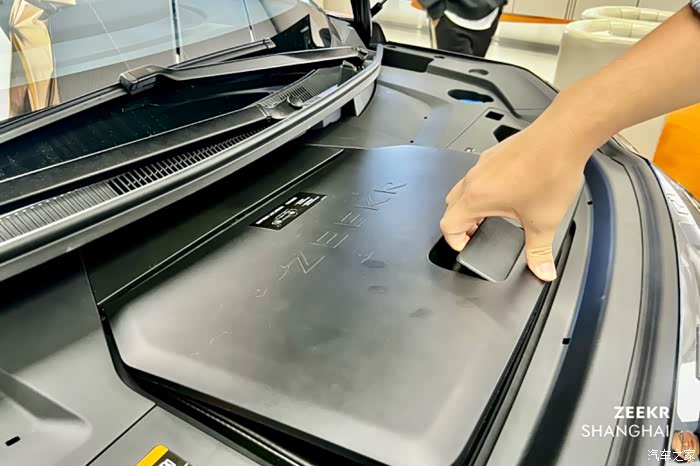 再来看看前仓,所占面积较极氪001要小,但是功能什么的不能少,布局也更合理,前备箱有前备箱盖,下面还有海绵;玻璃水加注口也留了。相比最早的极氪001的车主,加注玻璃水,各种方法扣装饰板,这就是进步呀,也是我们老车主的欣慰的一点。