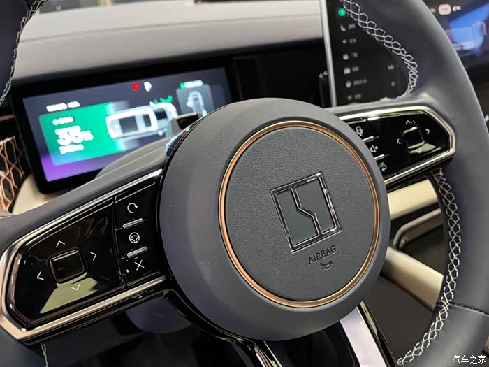 进入到车内,先来到主驾位置;标榜宜家宜室的极氪009,在收集到极氪001车主众多意见后,在极氪009上有了明显的改善,仪表盘变大了,看着比较舒服。方向盘上的多功能按键也有触摸板变成了按键,而且按键手感还很好,你这让我很羡慕,按下来的反馈也比较不错。有一点还是要改善一下,没有HUD抬头显示,习惯了极氪001,还是有点不习惯的。