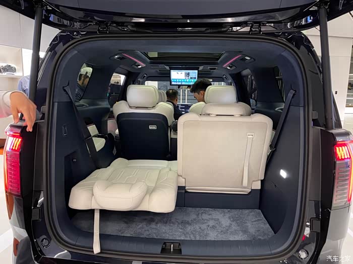 第三排还可以完全放倒,往前能放倒,往后也可以躺平;这点也算是极氪009的首创吧。如果正常做第三排的话,后备箱还可以放24寸的行李箱6个,真真的足够大。极氪009这空间玩的真溜。