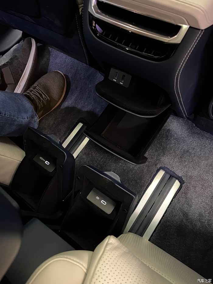 有较多的type C充电接口,前排的出风口下方有2个收纳盒,可以放翻转屏幕的遥控器,底部的收纳盒空间更大,实用性很高。
