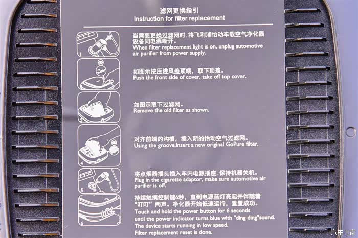 盖子上还有更换滤芯的详细说明,非常的人性化。