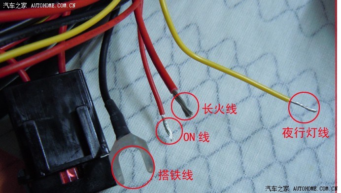 1号为加热系统主供电线(比较粗,负载大,两个加热同时开启最大功率大约100W),线为红色为了安全,套上了耐高温石蜡管;线头做卡子插在了5上(在保险2右边有一个空位保险座,带长电);3号位中的绿线为原车线,白线为防盗器原来接的线,为了省事就把加热系统中的ON线并在了白线上(挡住了看不见),此线是给控制开关供电控制继电器吸合的。