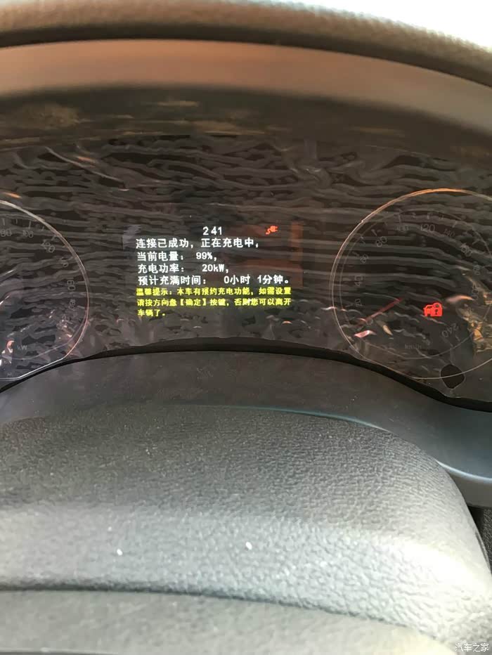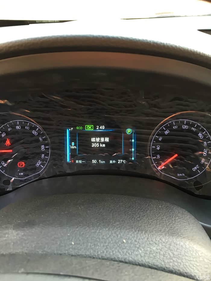 充电结束,从0%到100%电表共耗电52度左右,开启钥匙,显示续航305。