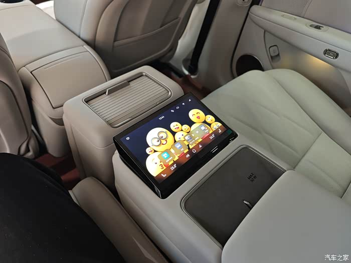 看了这个中岛还是挺有档次的,小屏幕也可以控制车上娱乐、空调和车窗之类的功能。还带一个50W无线充电,算上前排两个,车上有三个。