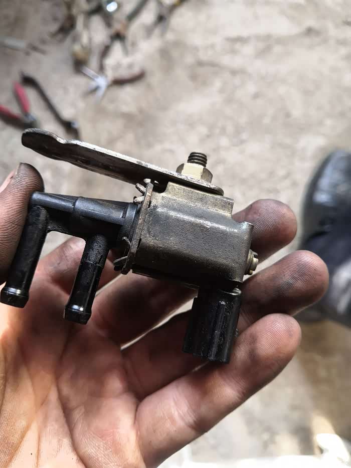 日本产的电磁阀,油箱里的汽油挥发通过这个东西抽到气缸去燃烧,这个东西坏了会影响废气的循环,喷油量不准影响充分燃烧增加油耗,尾气排放加重,发动机启动也不顺畅。
