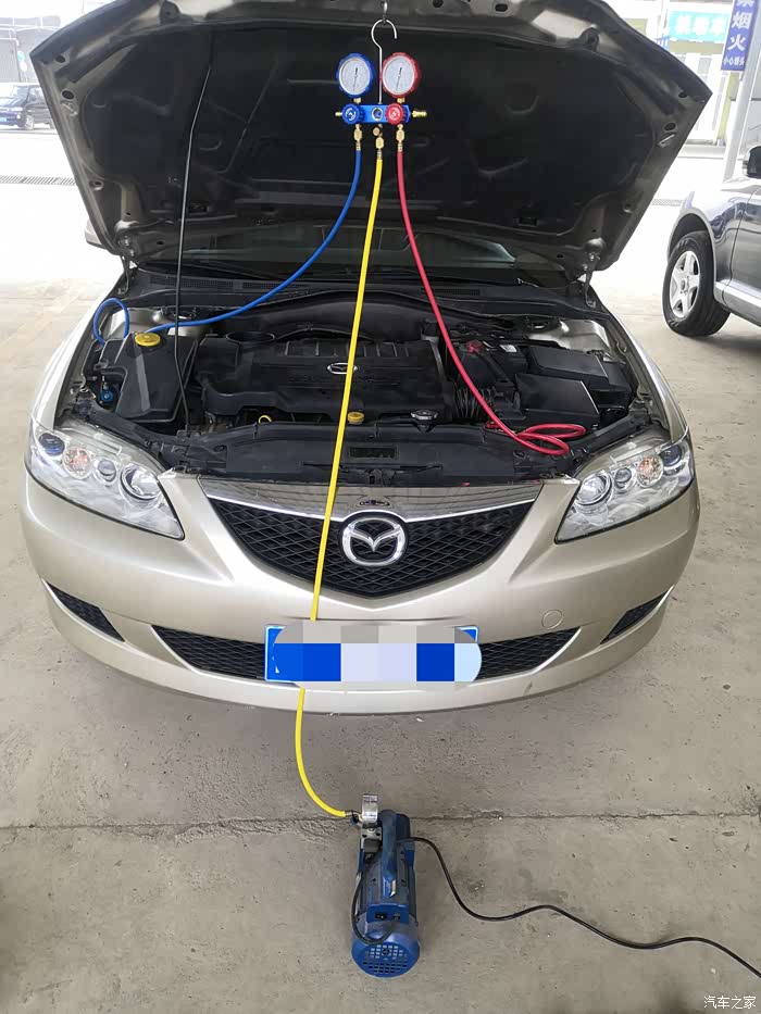 抽真空后就可以加注了,其实大家也可以自己动手的,真空机和连接管几百块。蓝色是低压,红色是高压,黄色是抽真空和加注口。把空调调到最冷,油门踩到1500左右轰几分钟,低压表显示0.15-0.3mpa之间就好。换完后空调恢复冰凉感