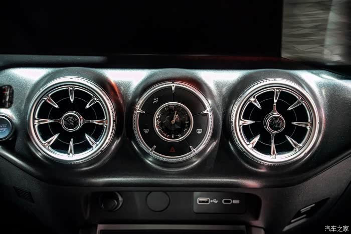 涡轮样式的空调出风口比较少见,拧动起来有金属的“嗒嗒嗒”声音,听着舒服,中间装备了石英钟的设计,这在豪华车型上见的比较多。