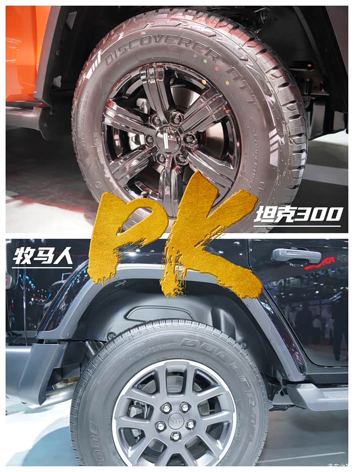 牧马人使用的是普利司通的HT胎,这是一款公路胎,突出在公路上行驶的舒适性和安静。坦克300配备的是固铂的HT胎,不过在车展上购买,可以免费更换固铂的AT胎,这是越野爱好者使用最广的轮胎,耐用性和在非铺装路面的附着力大大超过一般的HT胎。