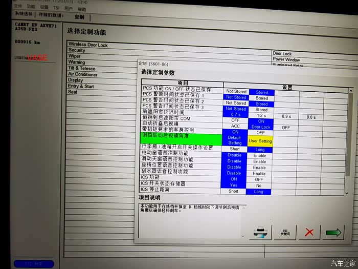 经过摸索,查找原因。是这里的问题。在车辆定制里面,把倒车联动后视镜角度的Default setting改成User setting. 就可以任意的设置并且保存想要的下翻角度了