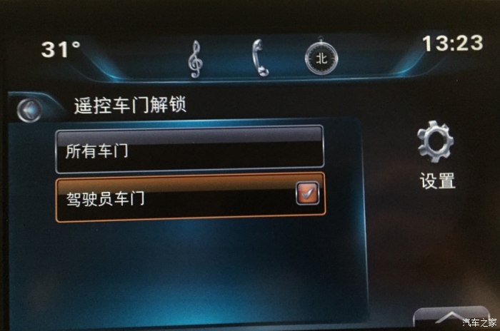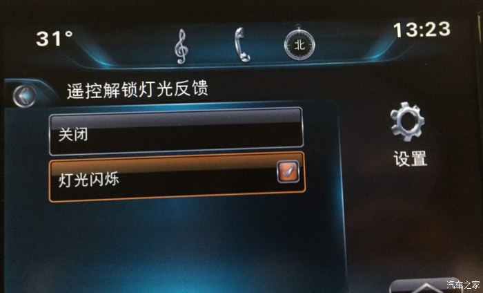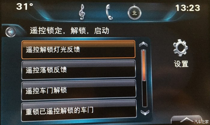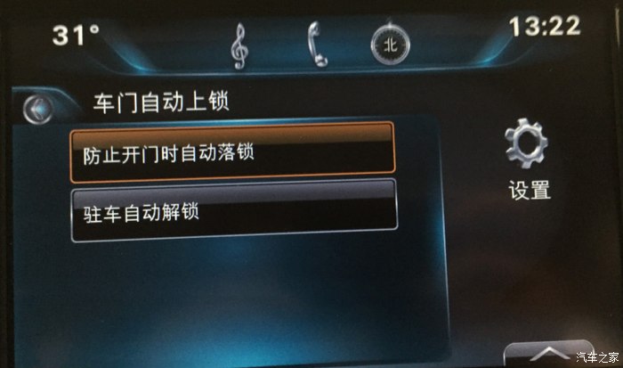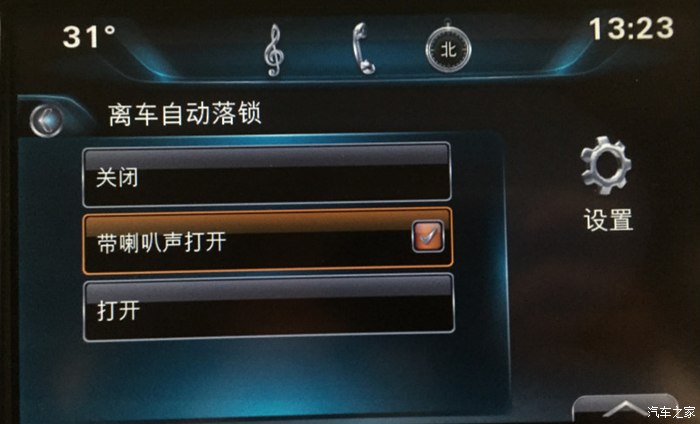 也是好功能。驾驶员持遥控钥匙离车后,无需用遥控钥匙锁车,车辆将自动锁车。这里可选择是否开启自动锁车,如果选择带喇叭声打开,车辆锁车时会鸣笛一声以提醒。建议开启此项。非常实用。注:一旦设定了离车自动落锁,离车必须注意车辆的落锁提示。未听到落锁提示或听到异常提示,一定要回车子里去看看出了什么问题,确保安全。