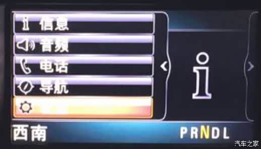 启动车子后,在任何一个界面下,按方向盘右区圆盘左键均可调出仪表盘屏幕菜单。一共有信息、音频、电话、导航、设置五项内容。按上下键选择所需项目,按确定键可进入该项目。