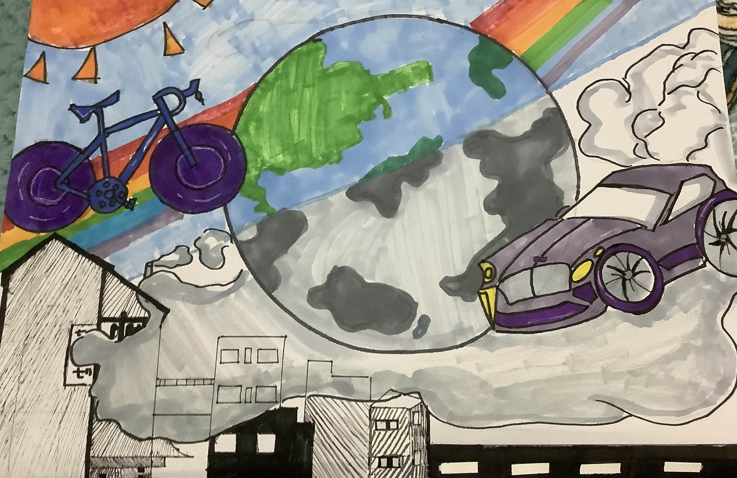 这幅画我用两种世界的方法展现了 一遍是没有污染的环境很多彩 一边是长期汽车尾气污染造成的 其实自行车也可以代替汽车出行减少些对空气的污染