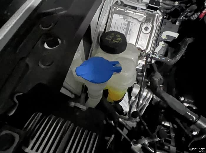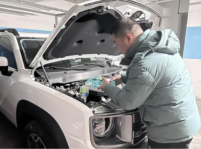 排空后,就可以开始加注新的玻璃水了。首先打开前机盖(大狗的前机盖开关在主驾驶的下方,有一个红色的按钮,向后掰一下就打能打开),然后绕到车头前部,将手伸进机舱内,找到并拉动扳手,前机盖就能打开了。大狗的前机盖是有液压杆的,手动打开后就能自动支撑,无需额外的支撑杆。