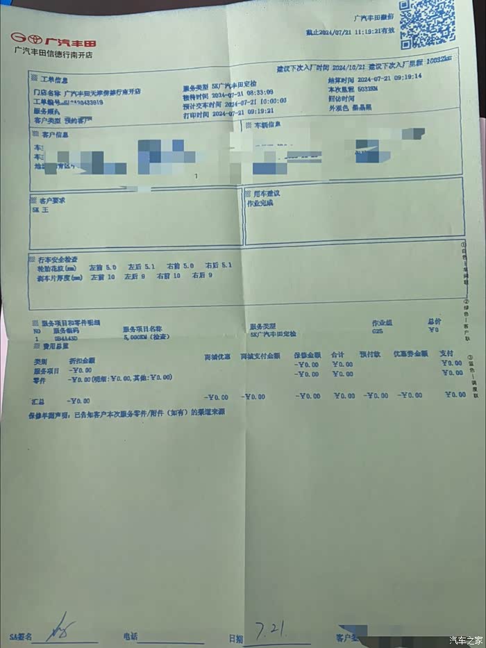 开到店后,4S店相关工作人员进行了询问,并检查了车辆外观,无问题后,登记了相关信息,并说明了首保的检查项目,询问使用过程由于问题,我提出电动门开关门声音比较大,是不是缺少润滑,结果大哥说丰田车门太薄,所以声音大,都这样,我也是无语了,我说那你给我涂抹点润滑油吧。不知道大哥有没有听进去。