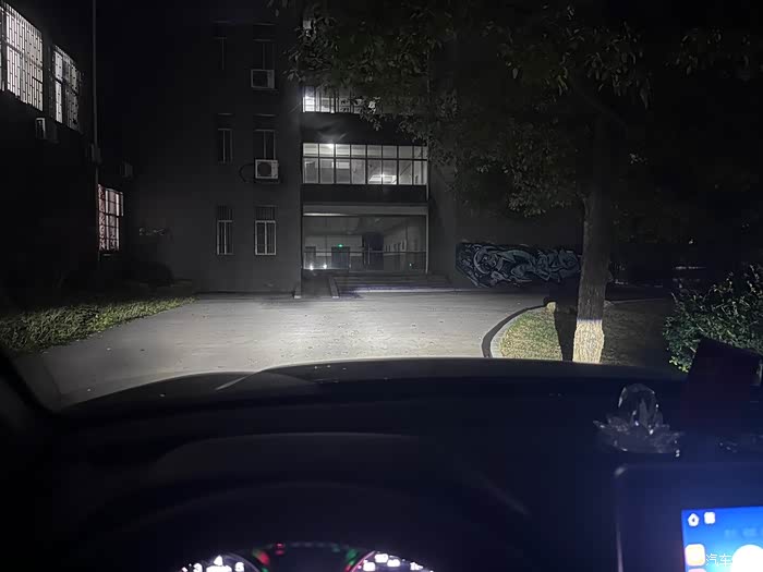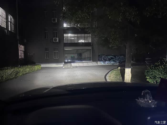 这个时候我们可以看到大灯照射的更加远了,前面楼房的台阶被全部照射到了。我一般车子空载时把大灯调到3,满载时调到1。