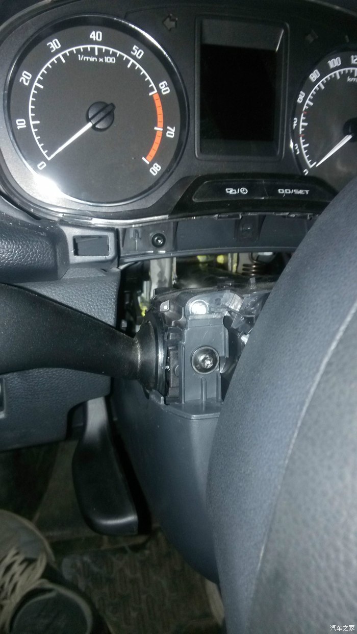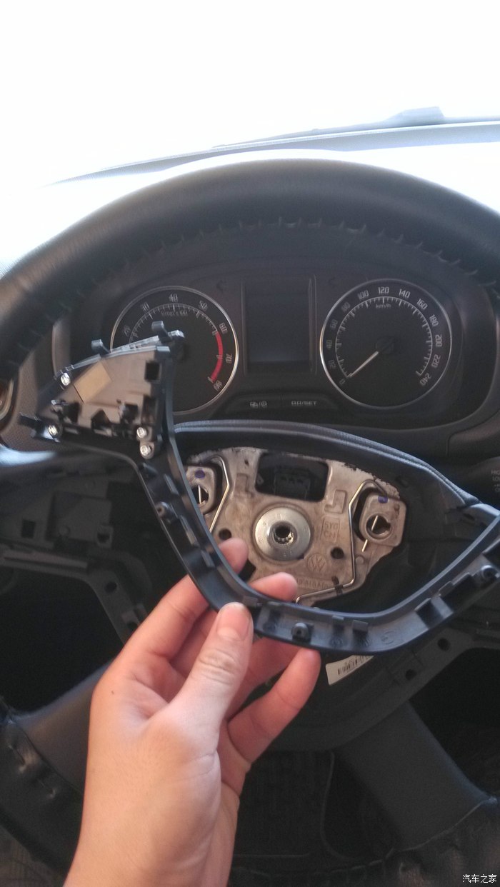 打开方向盘高低调节,放到最低,拆方向盘上护盖,直接往外掰就行,然后一块取下仪表盘外罩,直接往外掰就行,没有技术含量,然后方向盘左转90°左右