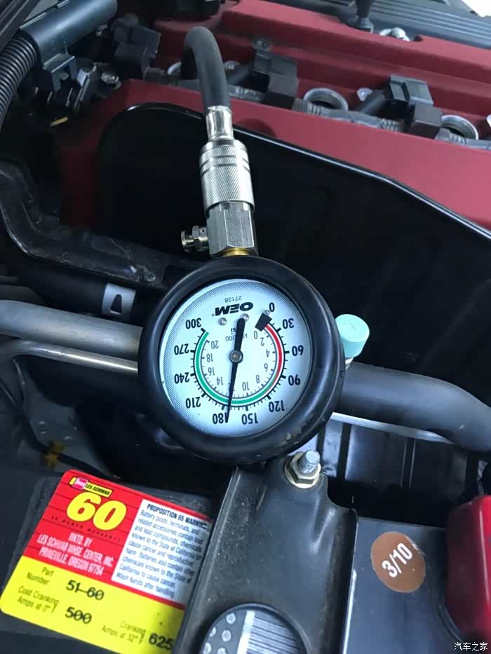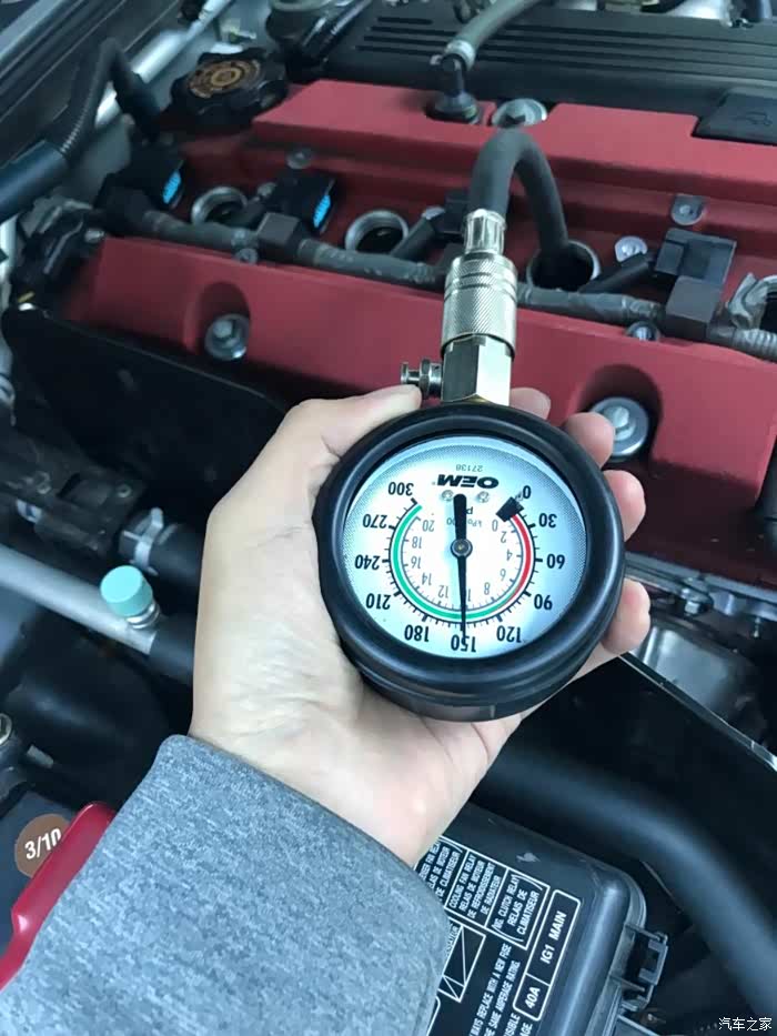 跑回店里拿工具测试缸压,发现所有气缸压力不正常。(正常工况好的F20C缸压在210-250左右)