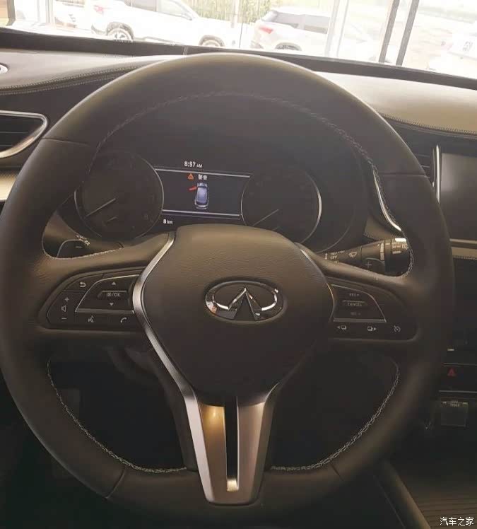 QX50的内饰豪华感氛围感都不错,最喜欢的还是方向盘手感,大小尺寸适中,转向手感好,6点钟方向的银色装饰条设计也显得有运动感。