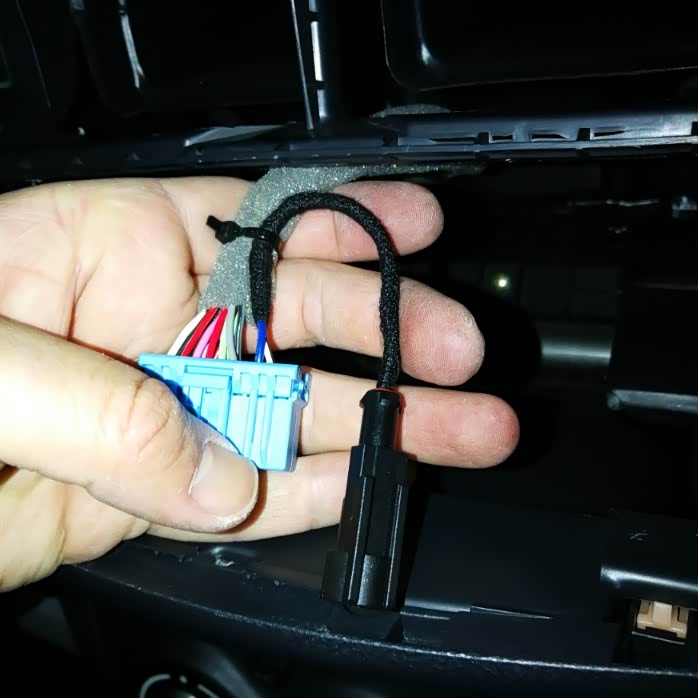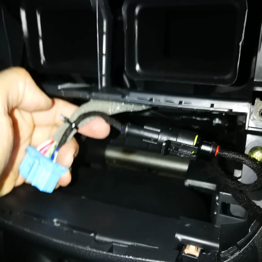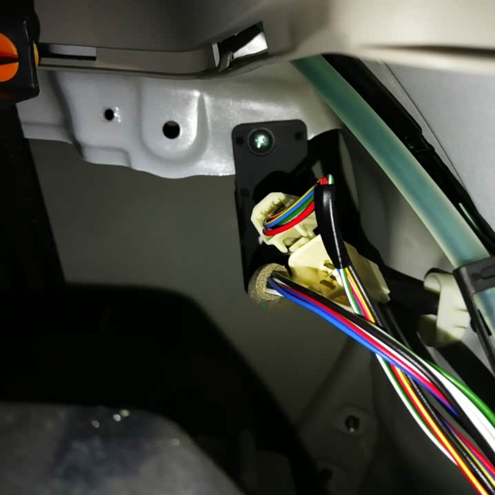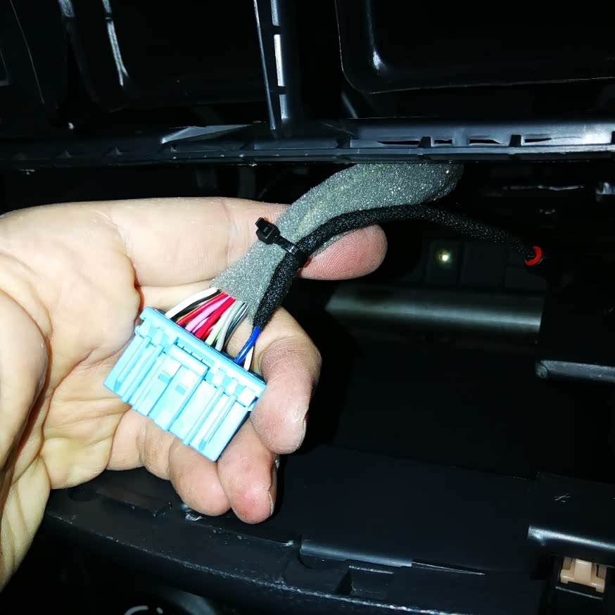 接下来,就是调整线束的长度,我是将线束沿着右侧地板原车机舱线槽过来的,用扎带和原车线束固定好,仪表台下面也一样,不要留太长,正好到主机够就行了,多余线束扎带扎好放在C柱千斤顶的饰板内就行了。