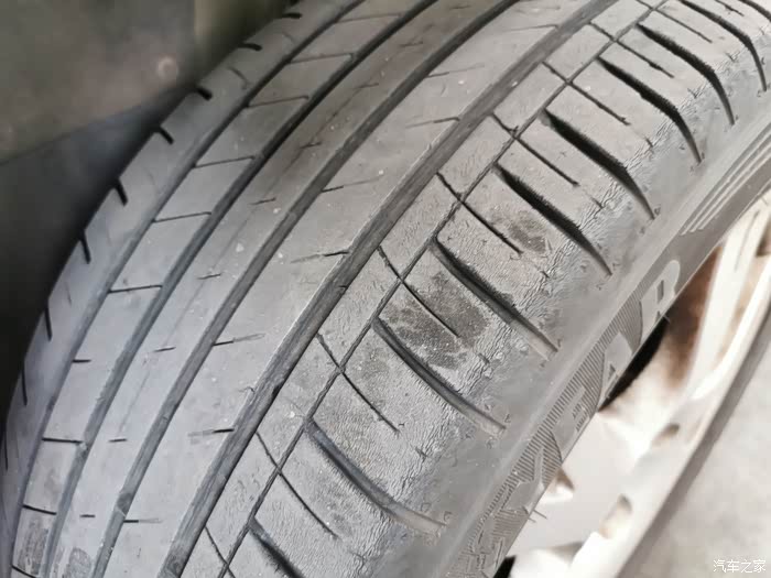 这是之前固特异的轮胎,可以很清楚的看出,轮胎花纹已经磨损的变浅,这样的轮胎刹车性能大打折扣,所以为了安全建议大家及早更换轮胎。