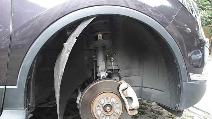 先把轮子拆了,再拆下轮子内挡板的半边,也就几个螺丝。