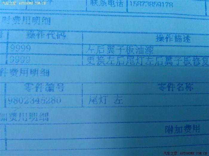 ,人品啊。遂被告之后天下午4点取车。然后定损,4S定损员小项告诉我旧款的尾灯只要300多元,新款的可能贵些要4、5百,但待他到电脑查询时才发现13款的尾灯1只是780元!包括车尾冀小板钣金、喷漆什么的一共1280元