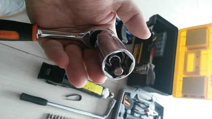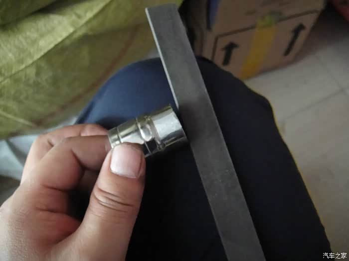 原来21mm的火花塞套筒里面的空间不够了,卸不掉第二个螺丝了,只好在把短的21mm套筒进行加工来替换长的套筒。加工指的是把对称2面磨平,好用活口扳手叼住。浪费了半个小时才完成,要是有电砂轮或者车床的话,分分钟的事。