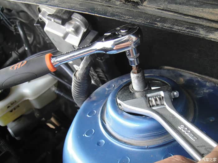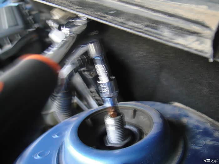 拆卸第一个减震螺丝,21mm套筒,里面是7mm内六角,劲不是很大,标准是25牛米的力。工具给力也很简单。注意看上面的高度空间有限,工具长放不进去。