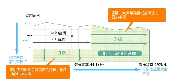 『高解析度音频』这个或者叫做无损音频也可以,CD并没有收录全部的声音,在以往我们听到的CD中,录制的声音仅是必要的一部分,并不是全部的原音,删除了声音的一部分。 而高解析度音频包含了许多声音的信息。信息量,包括"声音的厚度、细腻度、深度、声压级"等与以往有较大的差别。也就是说,高解析度音频的音质超越了CD。高解析度音频的音质更接近原音,可以感受到歌手的气息和现场的音乐感等以往CD中无法聆听到的细节及氛围。从数字化的角度(HZ/bit)来比较高解析度音频与CD以及MP3的区别,如下图所示: