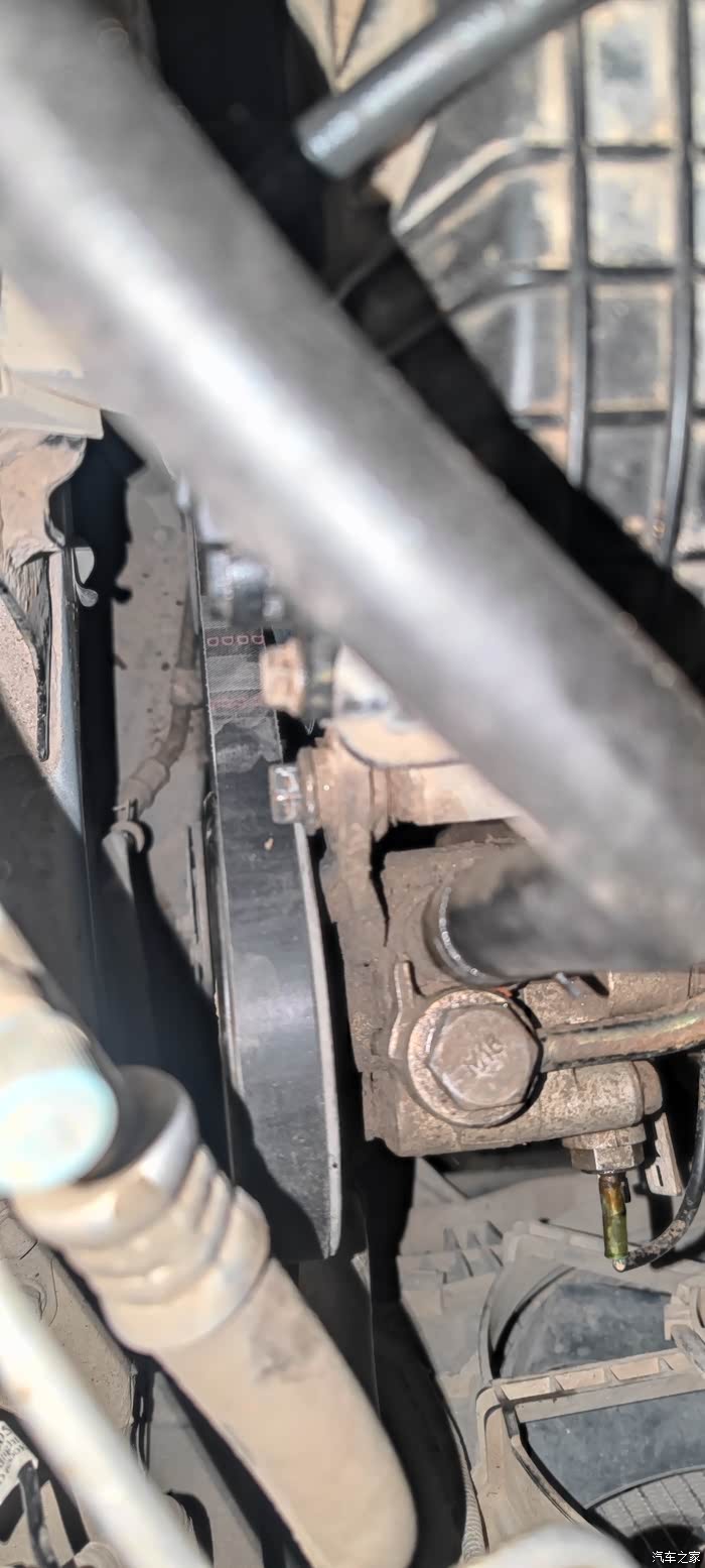 进入正题,先用千斤顶将副驾那侧打起来。然后先拆方向助力皮带,简称助力皮带。需要拆松三个螺丝,13,10的套筒。最明显的能看见的嘴前上的拧松,注意不是卸下来。在拧松调节松紧的螺丝。在正下方。第一次弄。支松这两个螺丝,纹丝不动。后来一直找螺丝,找不到。无意中用手摸到一个,在压缩机轮盘附近。大爷的,藏的深。一时发现不了。14的套筒套不进去。我的天。我想估计是15的。幸亏有15的梅花扳手。套进去拧松,而不是卸掉。