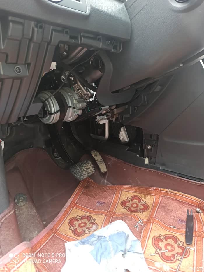 首先要把方向盘下面拆掉,油门踏板那也要拆,中控台拆掉,然后是小屏主机,空调模块,不一一列举了,拆开一目了然,就是胆大心细,撬开。