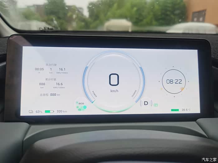 8月26日用快充把电充满,显示电量99%。开了一段里程136.2公里,2个人,空调1档,25度,开压缩机,100多公里的高速(保持在110左右的速度),APP上显示耗电21.6千瓦时,车上表显只剩63%的电量了(第二天早上一看总里程正好到了888了,拍个照纪念一下)。这样一算满电妥妥的380KM,还可以,对电车的要求和期望不能太高啊。
