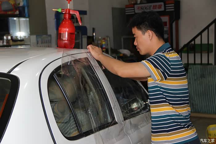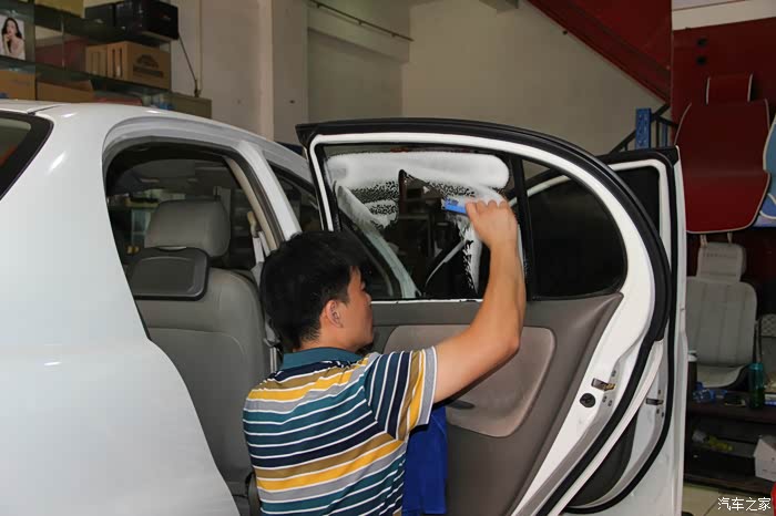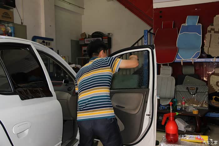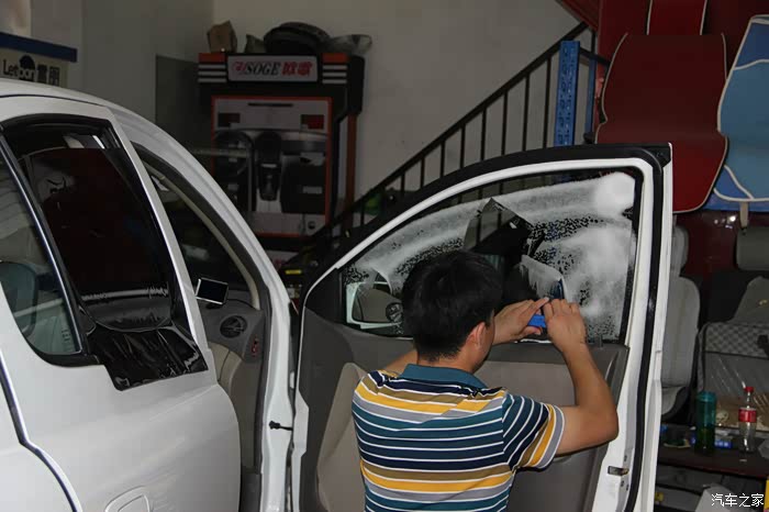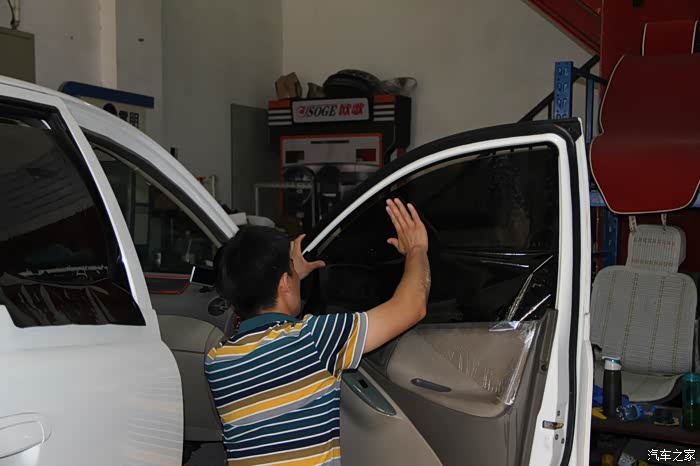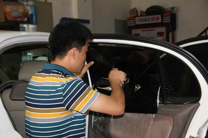 师傅将裁好的玻璃膜放在车门上方便使用