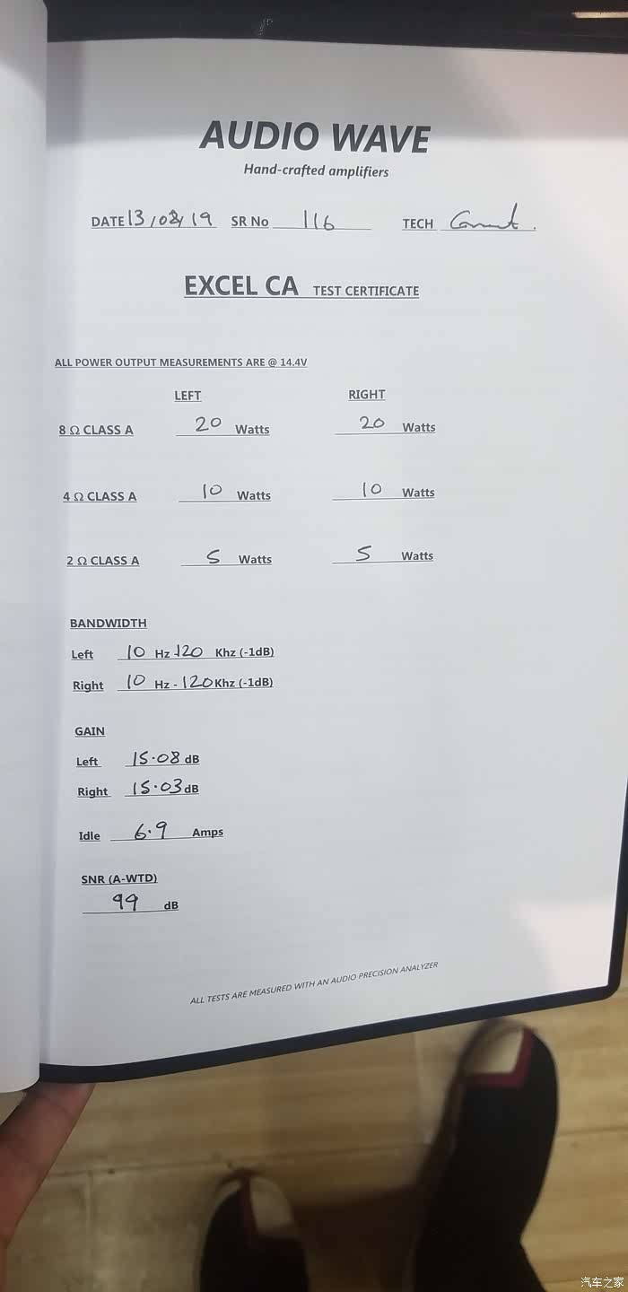 每一块AUDIO WAVE的功放均由GRANT HANAN先生亲自设计以及纯手工的装嵌,每块都的经过亲自测试,亲笔签名每块功放编号和测试数据,完美。