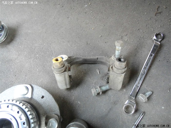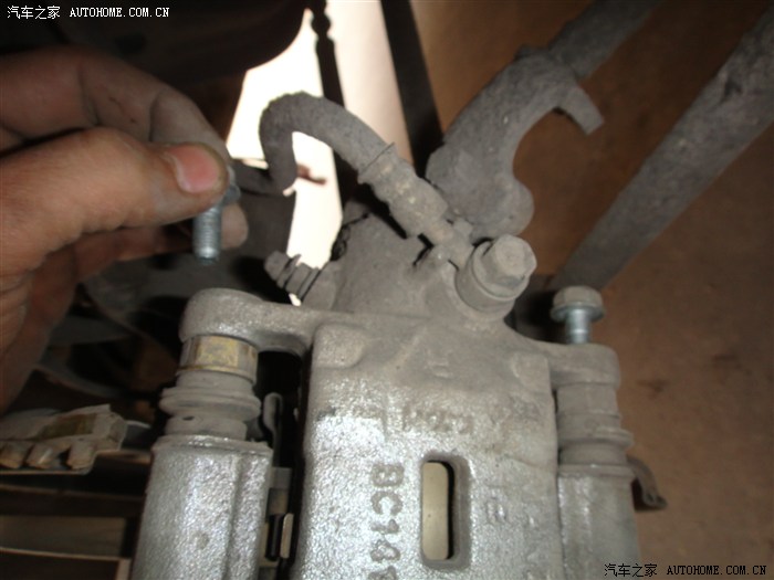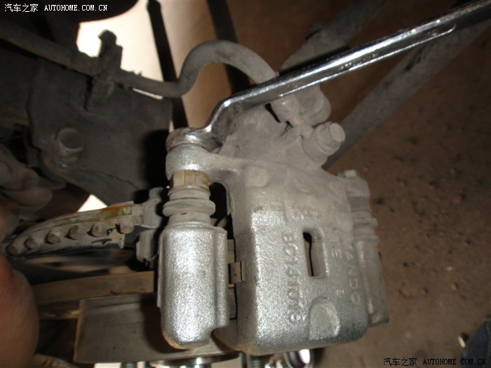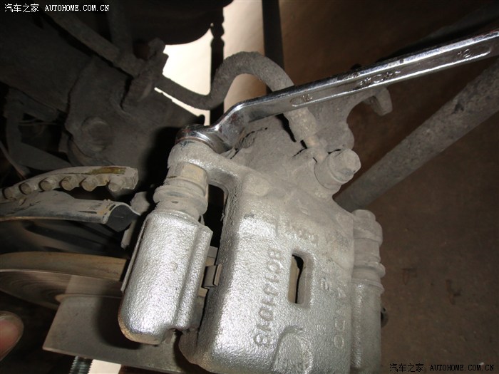 用14号梅花扳手拆下刹车泵螺丝,一定要松开手刹