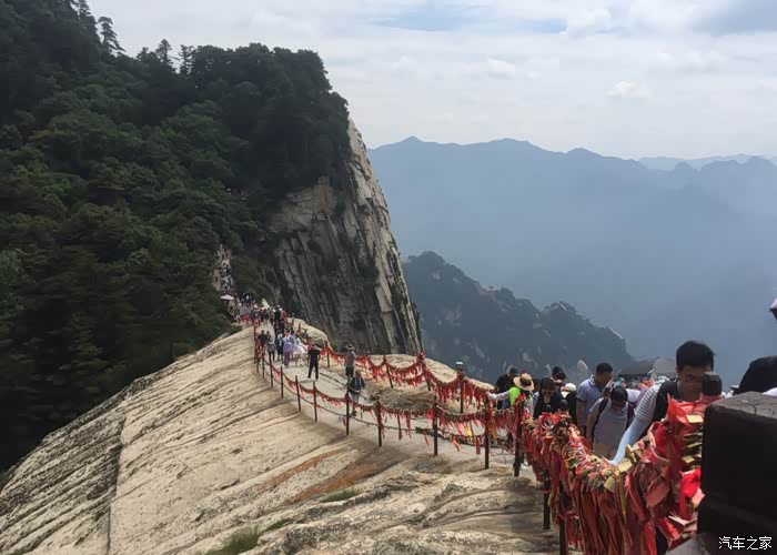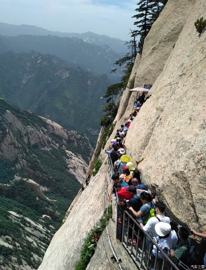 华山之惊险是众所周知的,所以慕名前来的游客真的很多,此时此刻,我们也拍了这人流的场隆重,缓步前行。好像人多些更能壮胆子,原本忐忑的心此时倒安定了不少,可以直面脚下的万丈深渊。