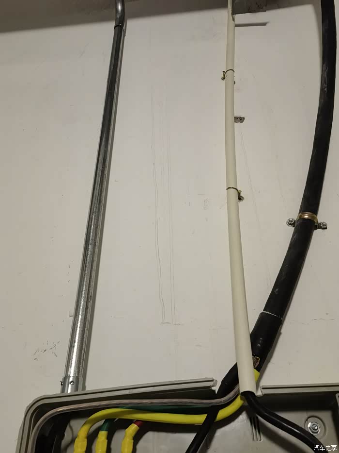 电缆线材用的江苏上上的6平方铜缆,绝对大厂,手里掂了下分量十足。外露电缆套上了电镀锌管,避免了线材裸露被腐蚀或者过热起火的问题。同电表箱另一个第三方充电桩对比之下显得走线和pvc管穿线山寨风十足。