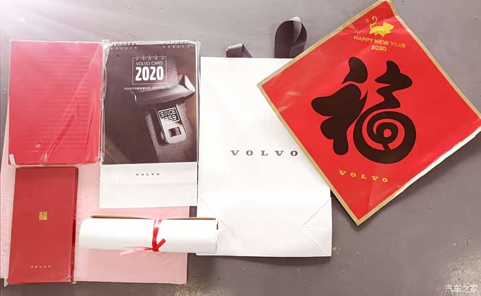 一份新年大礼包包含了:沃尔沃日历,沃尔沃的笔记本,一个环保袋,一副对联和福字