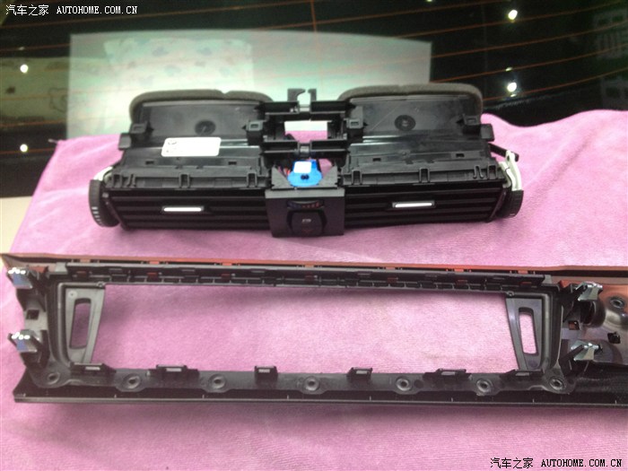 拆下出风口的样子,到此拆卸工作已经完成,你可以拿着面板去汽配城贴自己喜欢的颜色了。提示:把爱拽控制单元的线接上可以正常开车,就是难看点不影响驾驶。