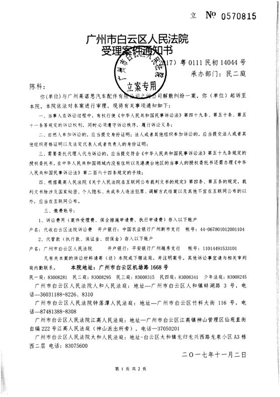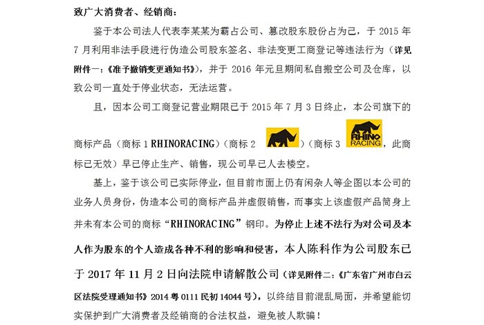 鉴于该公司已实际停业,但目前市面上仍有闲杂人等企图以本公司的业务人员身份,伪造本公司的商标产品并虚假销售,而事实上该虚假产品筒身上并未有本公司的商标“RHINORACING”钢印。为停止上述不法行为对公司及本人作为股东的个人造成各种不利的影响和侵害,本人陈科作为公司股东已于2017年11月2日向法院申请解散公司(详见附件二:《广东省广州市白云区法院受理通知书》2014粤0111民初14044号),以终结目前混乱局面,并希望能切实保护到广大消费者及经销商的合法权益,避免被人欺骗!