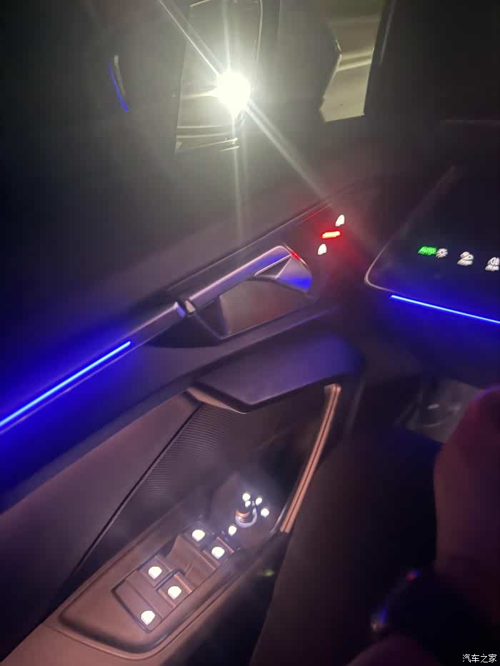 晚上还亮了氛围灯,小惊喜,奈何后视镜缺个防眩目的膜。一路被远光晃瞎了眼。还好中部后视镜还是保留大众良好风格,通过底部的手动拨片切换到防眩目的模式。