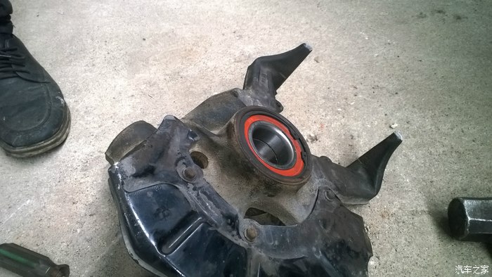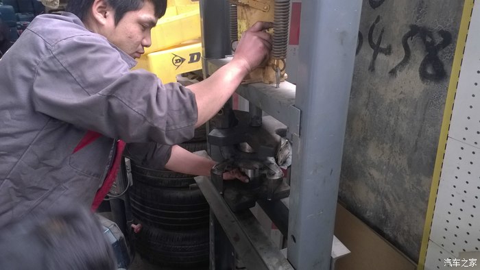 在安装轴承的时候出了小意外,由于没有把ABS感应盘装好,导致装配的时候卡住了,不得不再重新敲掉一个新的轴承,师傅想把它再往回装,密封圈都变形了,以后轴承油漏光了,肯定挂得快,这一点经验我还是有的,所断然拒绝,要求重新再换一个新的,为了不影响师傅的心情,我掏腰包换新的,接下来的作业,师傅更加卖力,整个施工过程还是比较满意的,虽说是小徒弟作业,但师傅会在旁边指导,有个细节还是不错的,用风炮打紧过的螺冒,师傅都再用手工再拧过一遍,以保证安全。