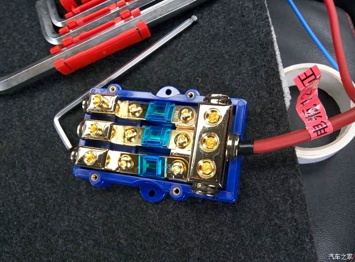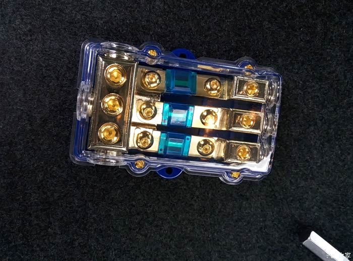 这个是一分三的保险,一根12V的电瓶正极接上,分出三个,三个都有60A的保险丝,做工很好,分量很足,都是铜的,改装必备,这东西可以接三个车载设备